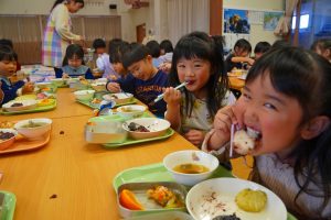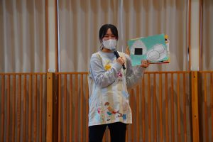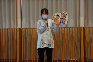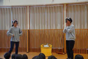 おもちが何から、どんなふうにできるかを話を聞きました。おもちは元気が出る食べ物!おもちを食べて、みんな仲良く、健康に過ごそうと教えてもらいました。