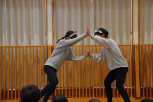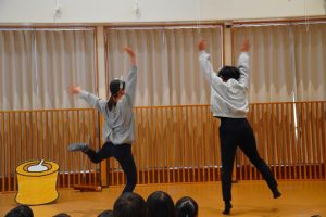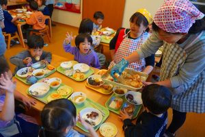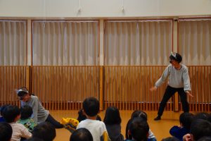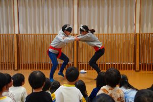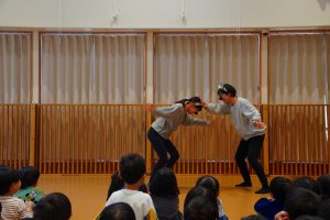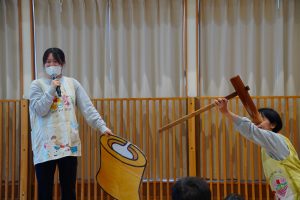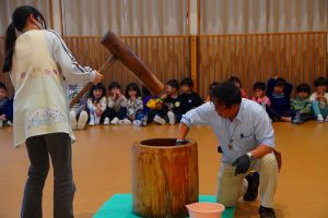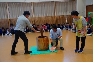 劇が終わると、炊き立てのもち米を見せてもらい、少しずつこねていく様子を見ました。代表の先生や年長さんが実際にもちつき体験をしてくれましたよ。みんなの「よいしょ~、よいしょ~」の掛け声も合わさって、おいしいおもちになりました。