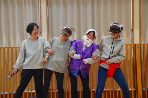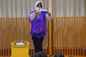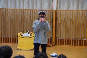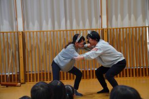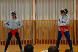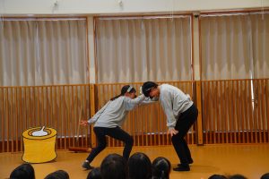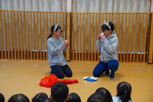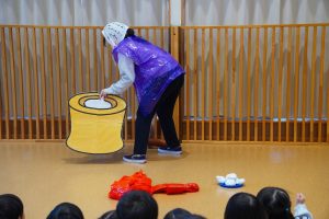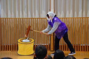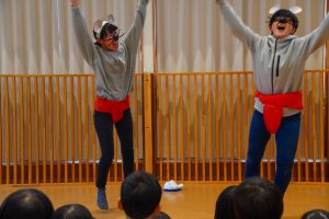 でかネズミは、やせネズミがおじいさんのおもちを食べて強くなったことを聞くと、おもちを食べてみたくなりました。そんな話を聞いたおじいさんは、二匹におもちと真っ赤なふんどしを用意してあげました。(こどもたちからは、「ふんどしって何?」の声が(笑))