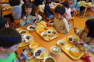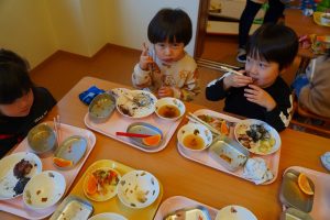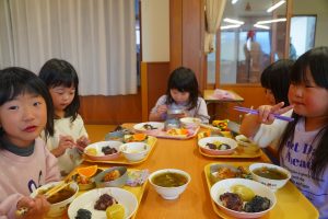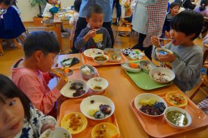 食リスクを考慮し、みんなが食べたのはぼたもちでしたが、4種類の味があり、楽しくおいしくいただきました。みんなはどの味が好みだったかな?何個食べたかな?