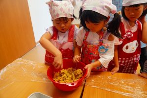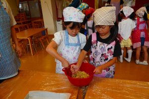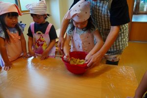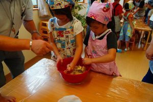 「もうちょっと水使わないと、くっつかなさそうー」「ちょっと、そっちのフォーク貸してみて」と、自分たちで試行錯誤しながら一人2個サモサを作っていきました。