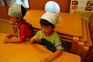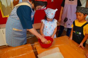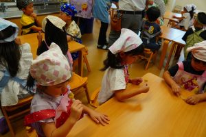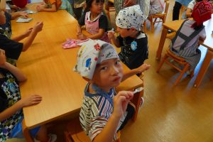 お買い物も終わり、お部屋でエプロンとバンダナに身を包んで手をきれいにしたら、今度は夕食のおかず「サモサ」作り!