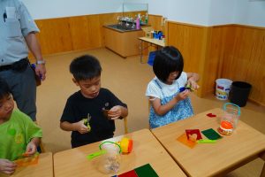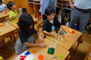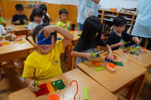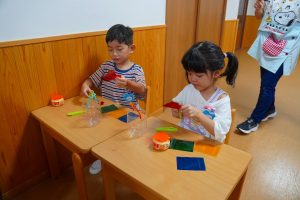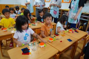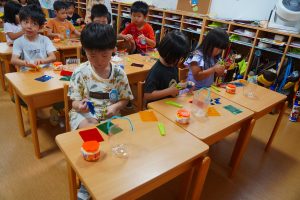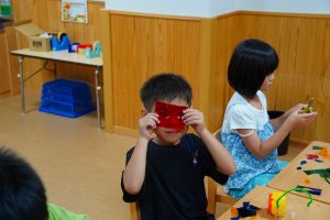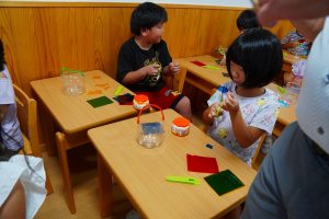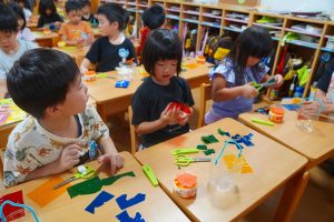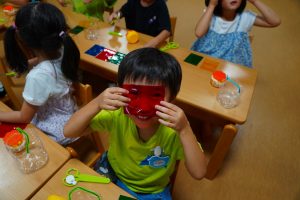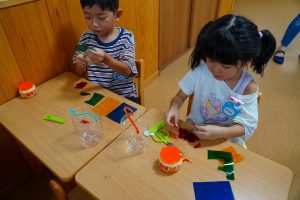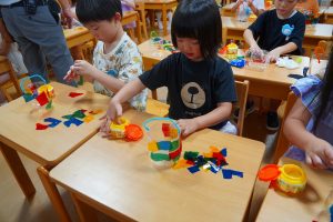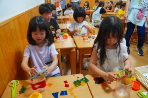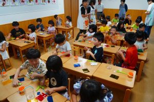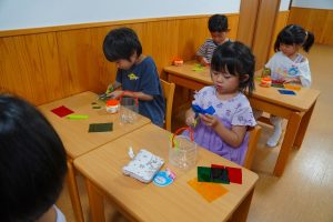 初めて過ごすこども園の夜🌙真っ暗すぎたら、怖いよね・・・ということで、みんなで灯りをともすためのオリジナルランタンを作りました。いろんな色のカラーセロハンを自分で好きな形にはさみで切り、のりで仮止めをして、先生にテープでとめてもらったら出来上がり!