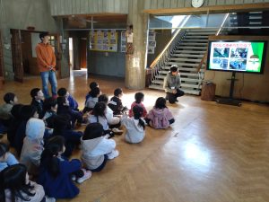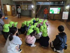 「であいのつどい」で、自然の家の所長さん、ジョーさんの話を聞いて、自然の家のことを知ったり、ルールを学んだりしました。