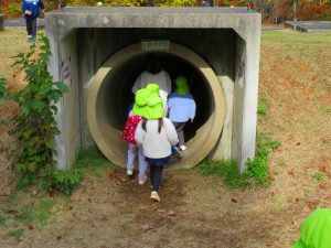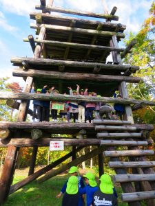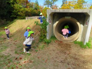 冒険の砦に登ったり、真っ暗な冒険トンネルで友達と手をつなぎながら何周もしたり・・・、たまにまつぼっくりや昆虫を見つけて盛り上がりつつも、自然に囲まれながら思いっきりあそびを楽しみました。