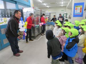 お部屋やバスでは「なんて言ってプレゼント渡す?」「どういう言葉をかけたらいいと思う?」という問いに、「働いてくれてありがとう!って言う!!」「いつも助けてくれてありがとう!って言わなきゃでしょ!」と、自分たちなりに言葉にしていたみんな。・・ですが、いざ対面すると緊張したのか言葉につまってしまう様子でした。
