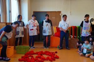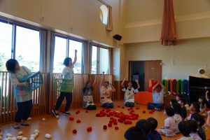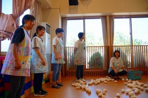 そこにお誕生日の先生4人も集まり、目の前にはなにやら赤と白のまりが・・・