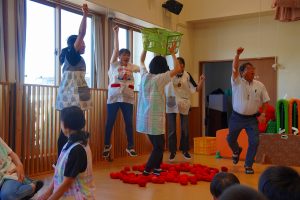 1つでも多くまりを入れようと、先生たちもかごを追いかけて走り回り、