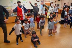 『あわてんぼうのサンタクロース』の曲に合わせ、サンタさんと一緒にみんなで踊ろう!ということで先生に踊りの振り付けを教えてもらい、サンタさんとリズムに合わせ楽しく踊りました!