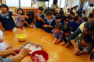 白、赤、黄色、緑の4色のお団子をグループに分かれて頑張って丸めてたくさんの団子を作りました。