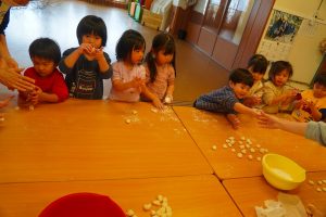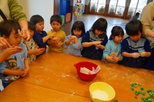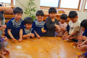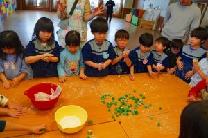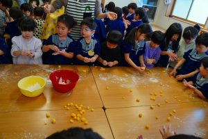 14日に、ぱんだぐみさん年少さん年中さん年長さんで団子の木に飾る団子作りをしました。