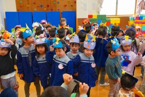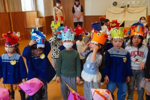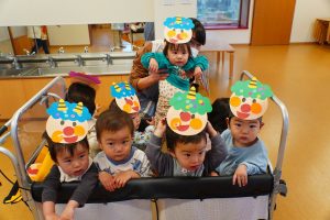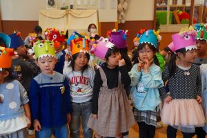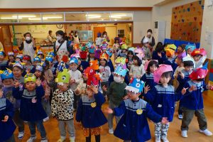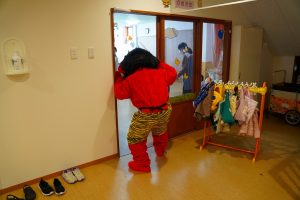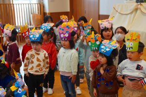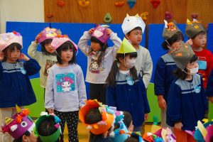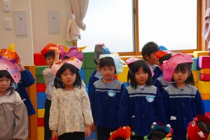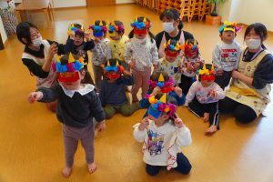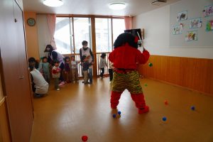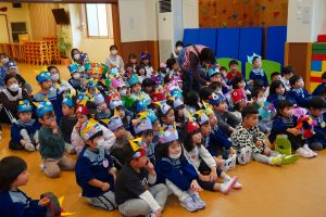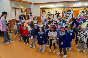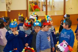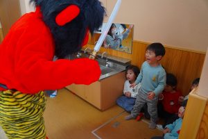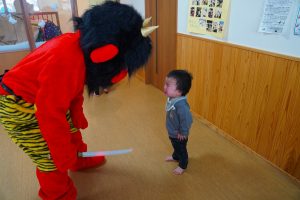 お集まりも鬼のお面をつけて参加。気分が高まっている子、怖いよ・・とつぶやく子、さまざまです。