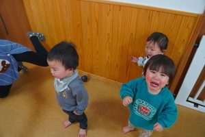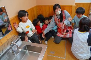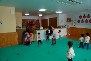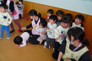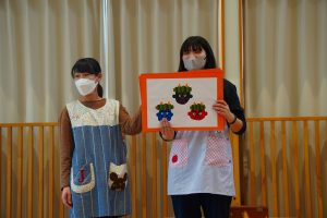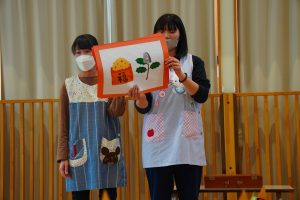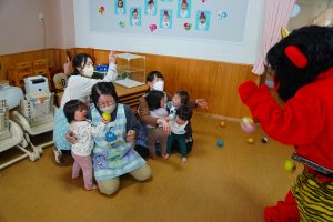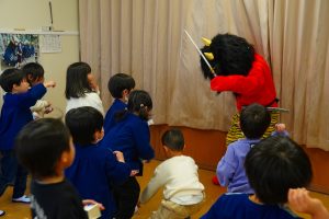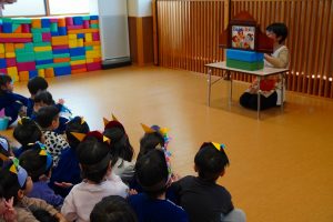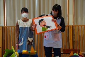 以上児さんが、節分にちなんだ紙芝居をよんでもらっている頃・・・