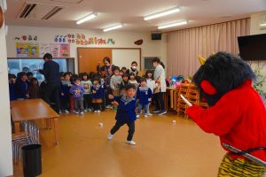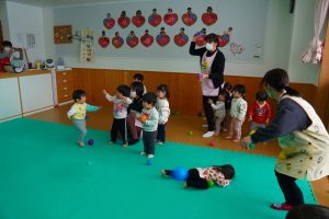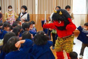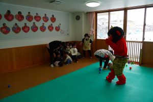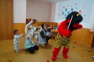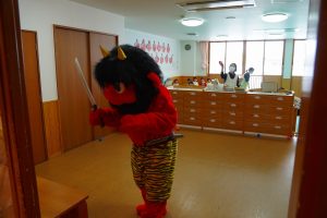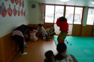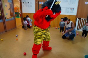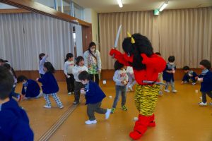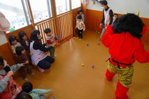 以上児さんがいるイベントホールにも💦さすが以上児さん!「鬼は外!福は内!」の掛け声も忘れず、一生懸命豆をまいて、自分の中にいる悪い鬼も退治しようと頑張りました⭐勇気のあるお友だち、たくさんいました!!