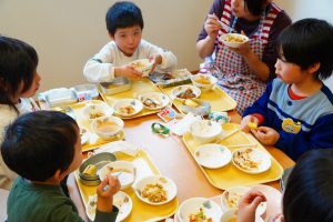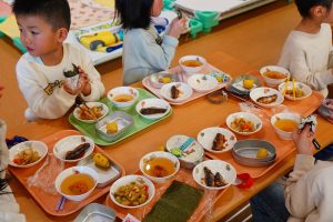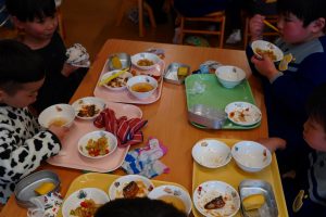 給食は恵方巻風に、ふりかけご飯の海苔巻きを作り、大きな口で、ばくっとモリモリ給食を食べました。せっかくの機会ですので、お家での今日のお話に触れていただいたり、節分の雰囲気を味わってくださいね👹